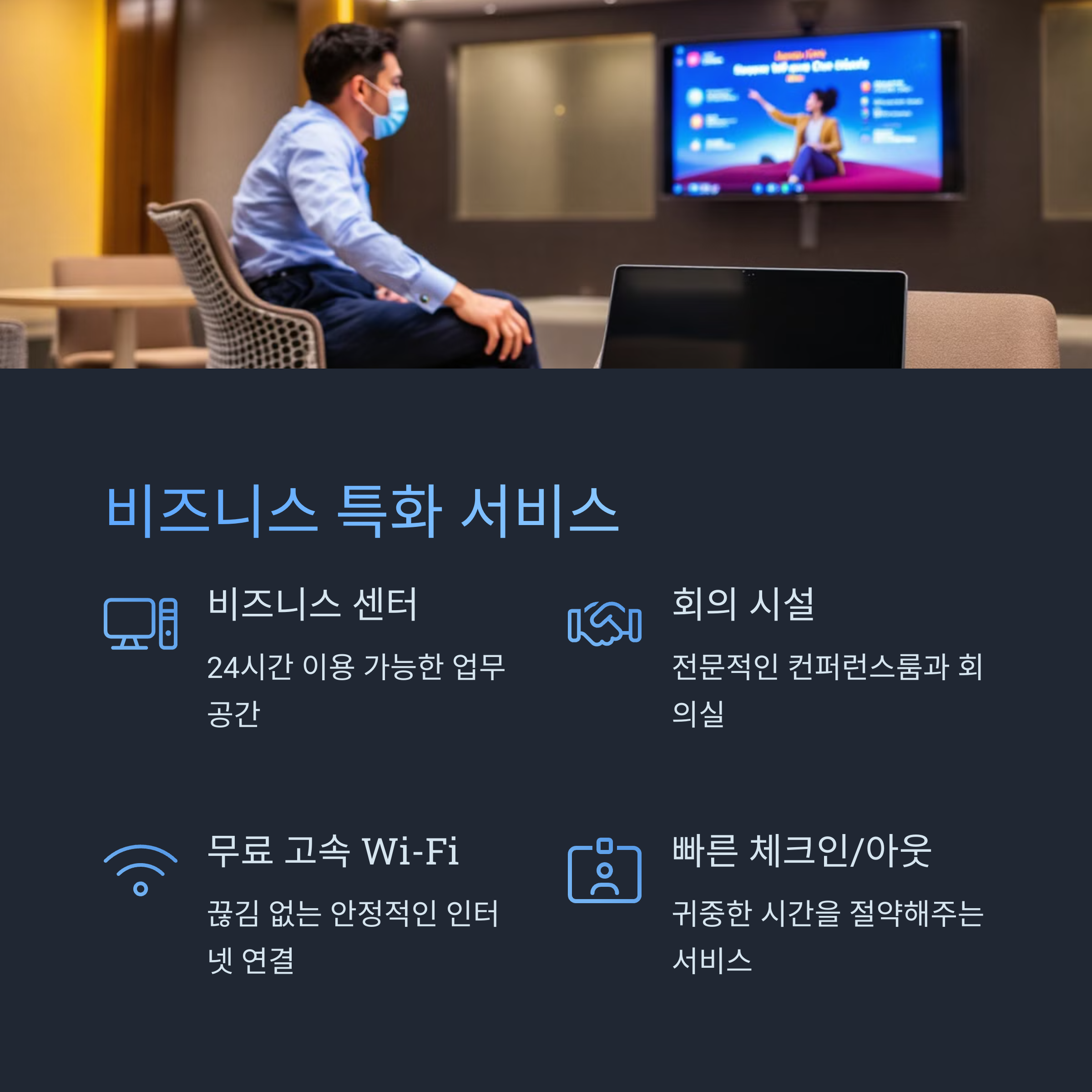 | 출장 특화 서비스 | 빠른 체크인, 회의실, 조식 제공 등 최적 환경 제공 |