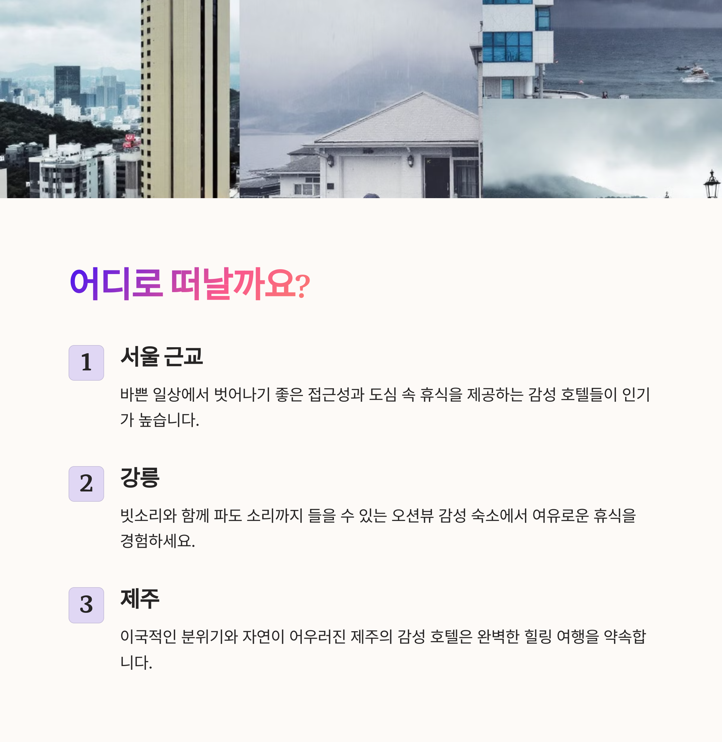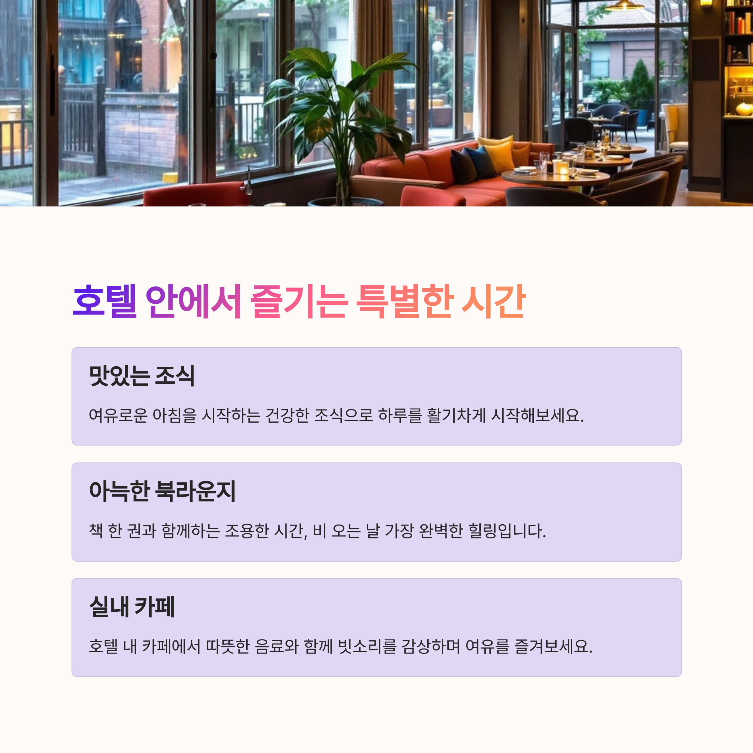 | 서울 근교, 강릉, 제주 산방산 인근 | 따뜻한 조명, 빗소리 들리는 창가, 북라운지 | 우천 시 조식 예약 여부 확인 및 실내 시설 체크 |