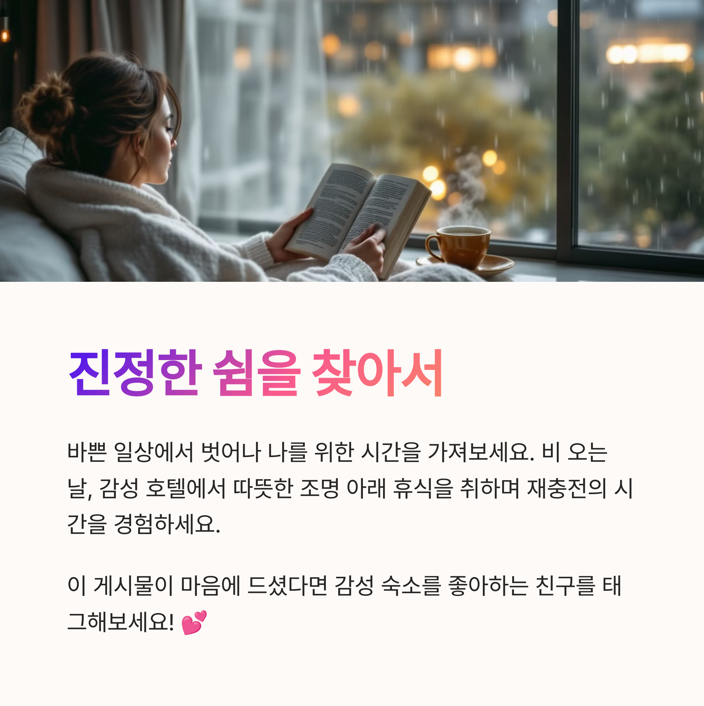 비 오는 날은 평소보다 더 조용하고 깊은 감정을 이끌어내는 날입니다. 이런 날일수록 좋은 공간에서의 휴식이 더 큰 의미를 지니게 되죠. 감성 호텔은 그런 하루를 특별하게 만들어주는 작은 안식처와도 같습니다. 따뜻한 조명 아래에서 보내는 조용한 시간, 커튼을 걷고 바라보는 회색빛 하늘, 그 속에서 느껴지는 여유와 안정감은 바쁜 삶 속 진정한 쉼을 느끼게 해줍니다. 오늘 소개한 호텔 리스트를 참고하셔서 여러분만의 감성적인 하루를 계획해보시길 바랍니다. 잠시의 쉼이지만 오래도록 기억에 남을 거예요.