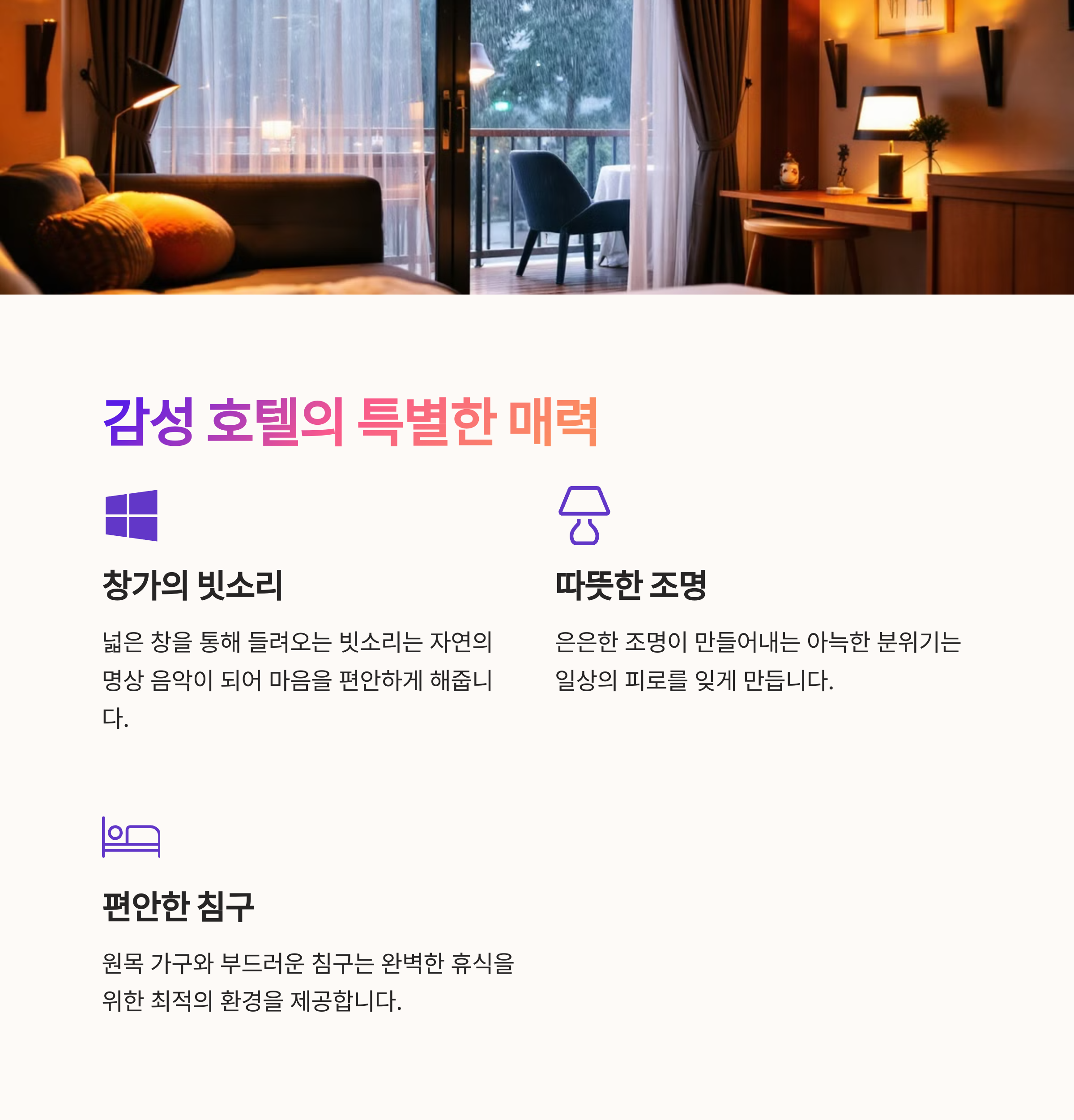 | 감성 호텔 특징 | 고요하고 아늑한 분위기와 따뜻한 감성 인테리어 |