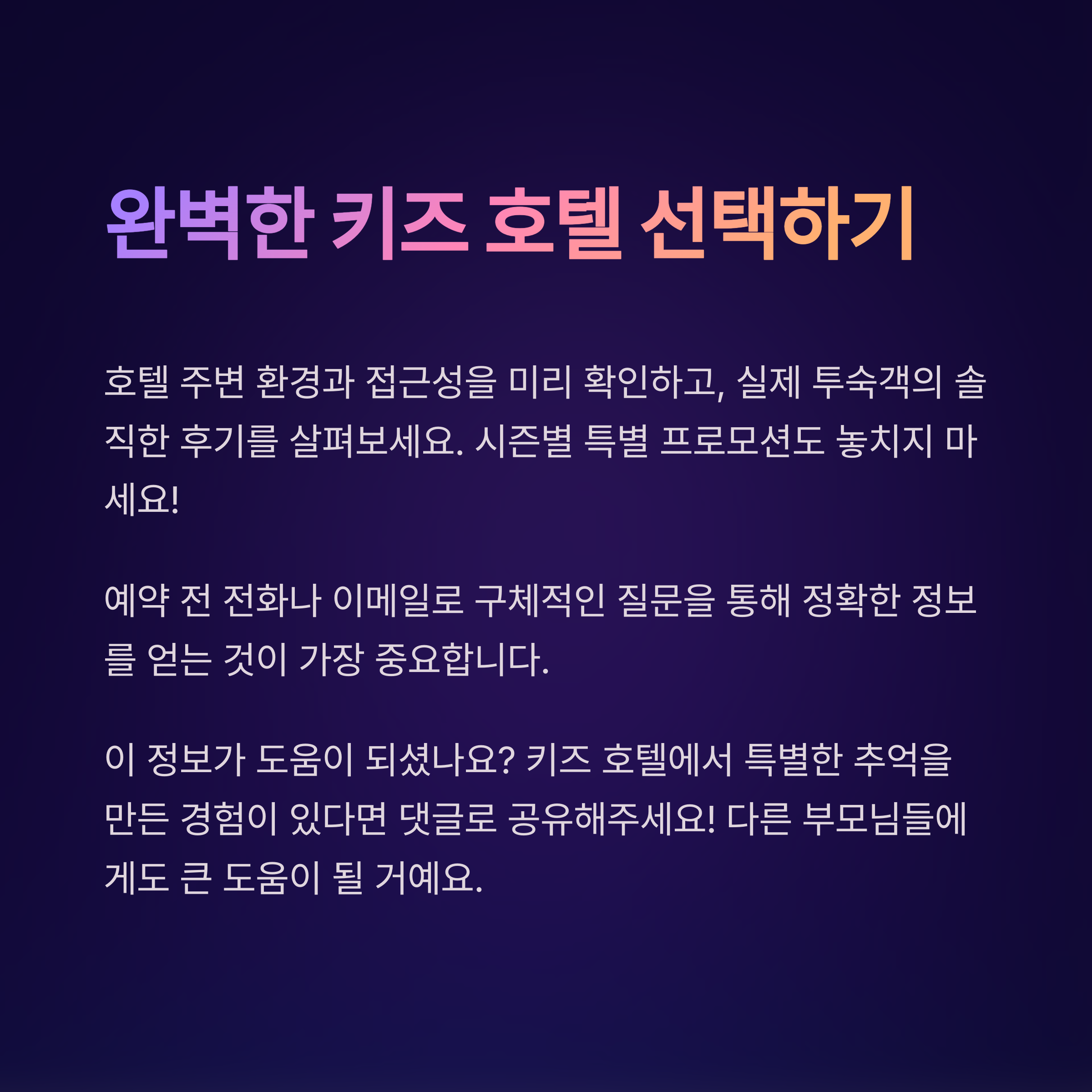 | 체크 포인트 | 실내 놀이방 유무, 방음, 주변 편의시설, 조식 및 키즈 서비스 구성 |