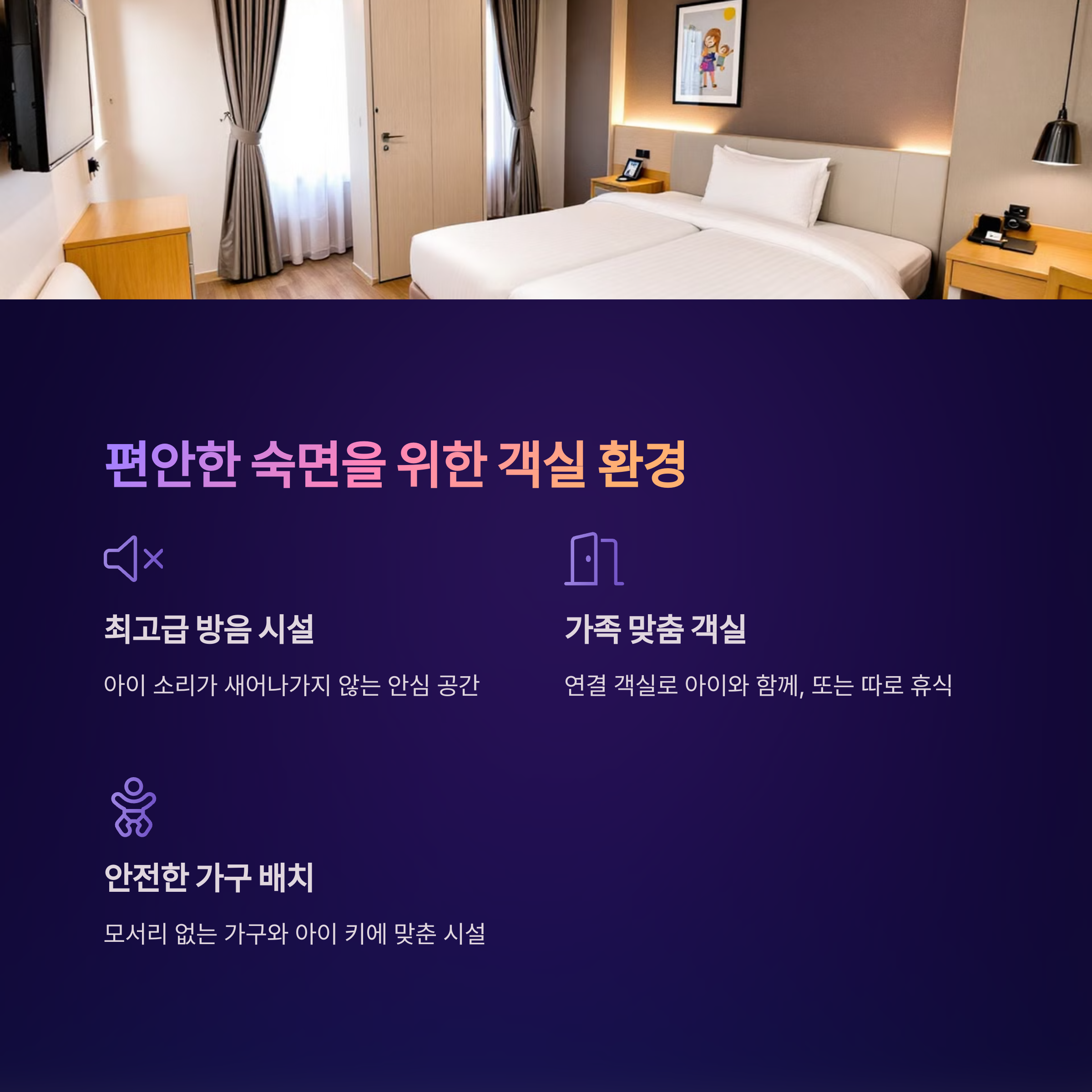 | 유아 안전 설계 및 용품 완비 | 부모 휴식 가능한 라운지·카페 여부 | 객실 위치, 키즈층 여부 사전 요청 권장 |