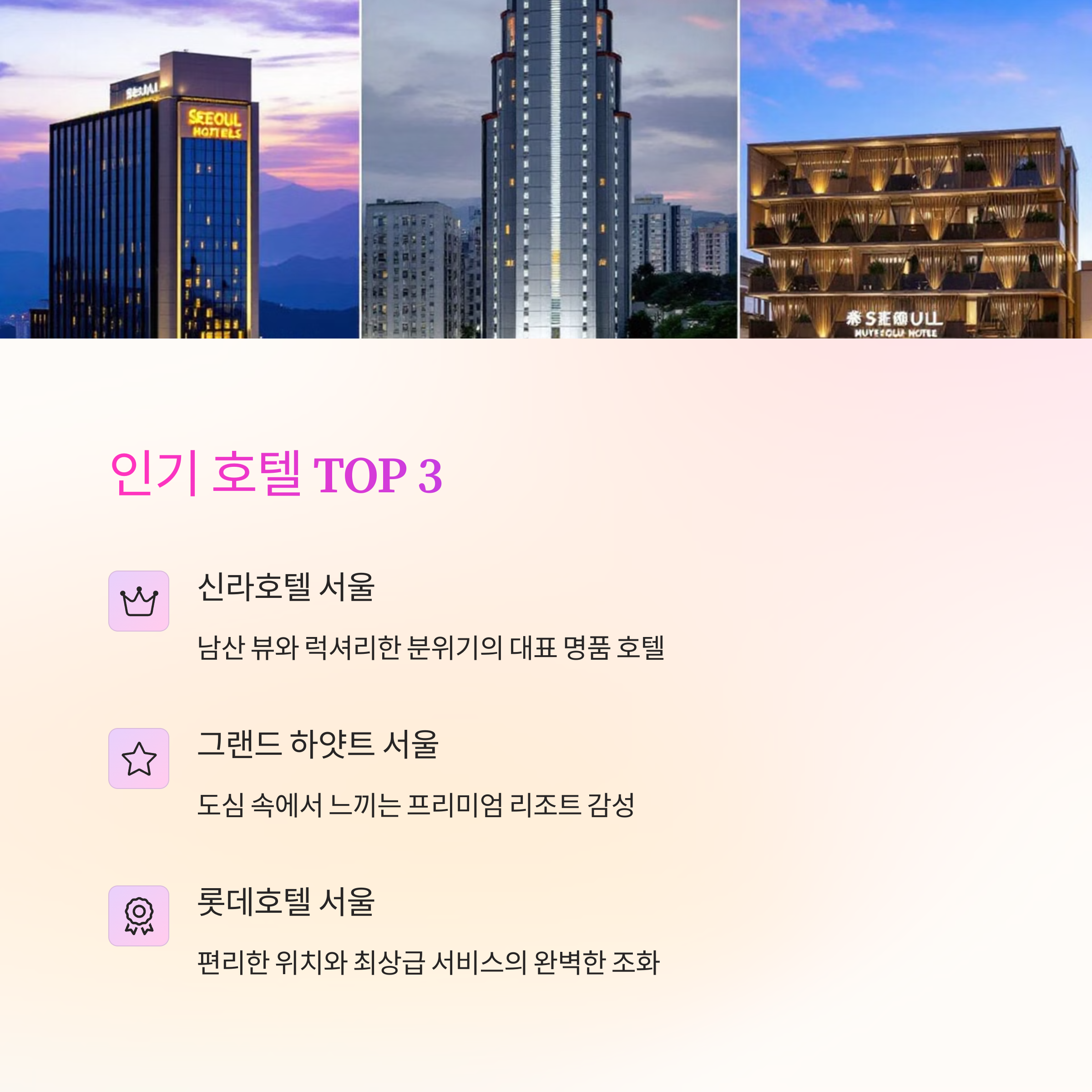 호텔 선택은 여행 전체의 분위기를 좌우할 만큼 중요한 요소입니다. 특히 인기 호텔은 검증된 서비스와 만족스러운 시설로 많은 이들의 사랑을 받고 있으며, 후회 없는 선택이 되어줍니다. 이번 리스트를 통해 여행 준비에 조금이나마 도움이 되셨기를 바랍니다. 예약 전 꼭 후기를 체크하고, 혜택을 꼼꼼히 비교하며 자신에게 가장 잘 맞는 호텔을 선택해보세요. 만족스러운 호캉스와 여행의 시작은 바로 좋은 호텔에서부터 시작됩니다.