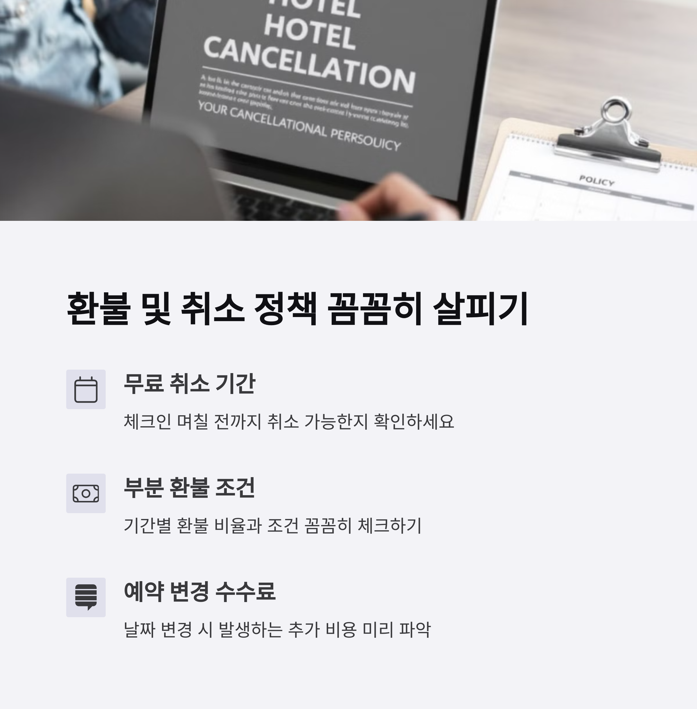 또 다른 주의할 점은 환불 정책과 예약 조건입니다. 겉보기에는 저렴해 보이는 호텔도, 비수기나 단기 특가 상품일 경우 환불 불가 조건이 붙어 있는 경우가 많습니다. 일정이 유동적인 여행자에게는 매우 불리한 조건이 될 수 있으며, 단 한 번의 일정 변경으로 수십만 원을 날릴 수도 있습니다. 예약 전에는 반드시 취소 및 변경 가능 여부를 체크하고, 가능한 한 무료 취소 옵션이 있는 상품을 선택하세요.