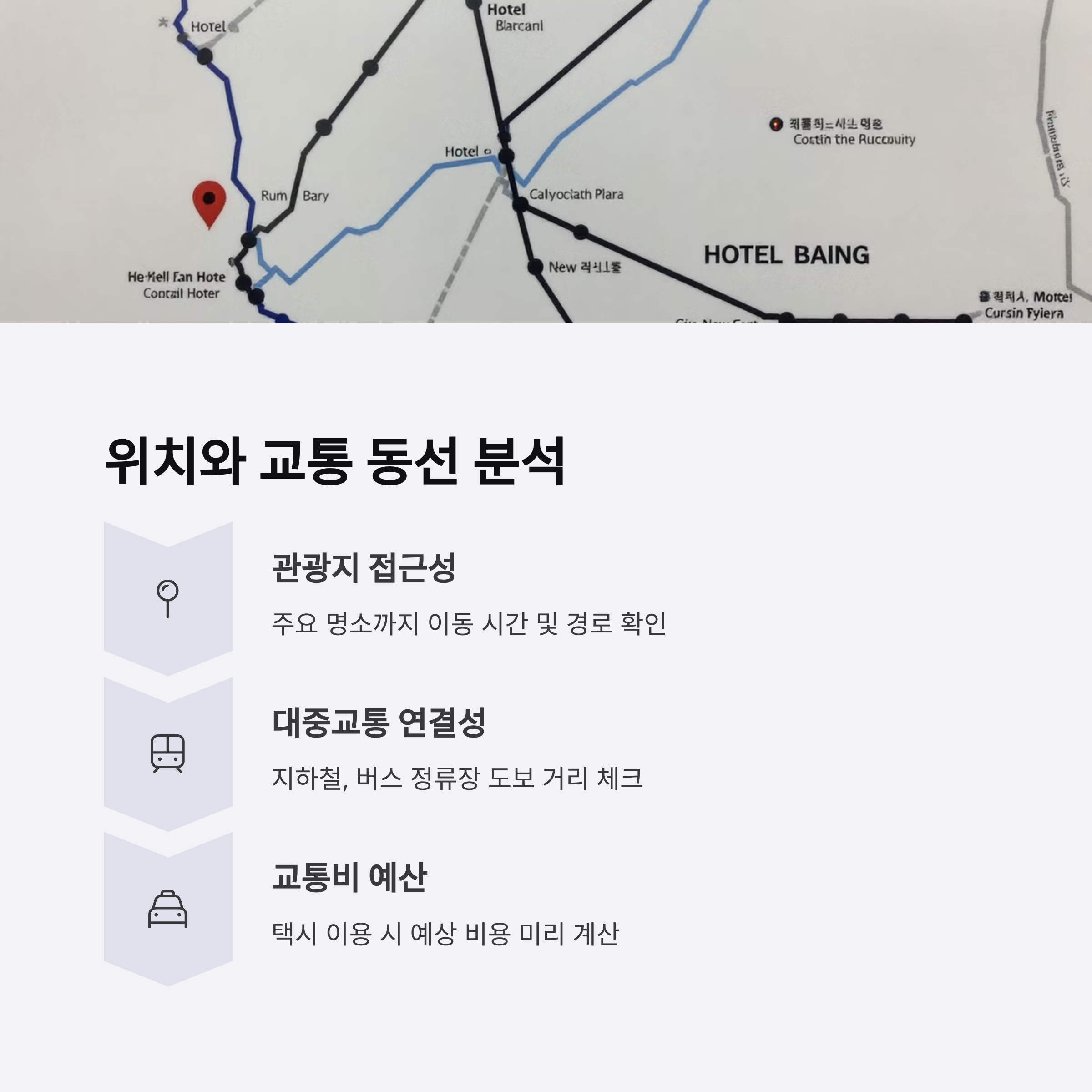 호텔 예약을 하면서 흔히 간과되는 요소 중 하나는 바로 위치와 교통 편의성입니다. 가격이 저렴하거나 후기 평점이 높다는 이유만으로 예약했다가, 실제로는 공항이나 주요 관광지와 너무 멀어 이동에 많은 시간을 허비하게 되는 경우가 많습니다. 특히 대중교통이 잘 연결되지 않은 외곽 지역에 있는 호텔을 선택하면, 택시나 렌터카 비용까지 더해져 총 여행 예산이 예상보다 훨씬 높아지는 상황을 초래할 수 있습니다. 따라서 단순히 숙소 자체만 보지 말고, 전체적인 이동 동선까지 함께 고려하는 것이 중요합니다.