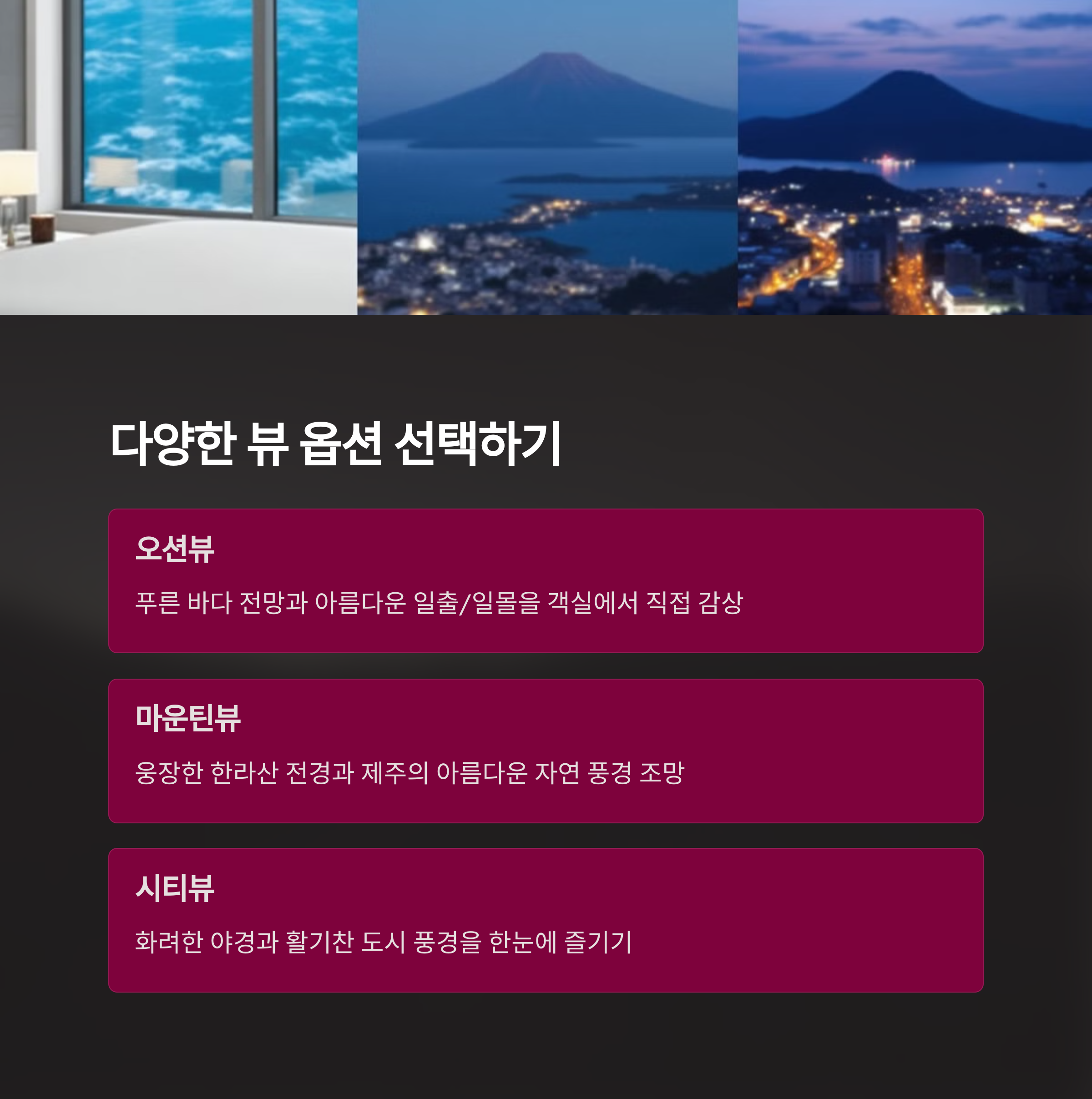 여행의 감성을 결정짓는 요소 중 하나는 바로 호텔 뷰입니다. 특히 제주는 자연의 색감과 분위기를 객실 안에서도 오롯이 느낄 수 있어야 진짜 제주다운 여행이 되죠. 그렇기에 많은 분들이 제주 호텔을 고를 때 ‘뷰 맛집’인지를 가장 먼저 확인하곤 합니다. 바다, 오름, 한라산까지… 창문 너머로 펼쳐지는 그림 같은 풍경은 그 자체로 힐링의 순간이 되고 여행의 감동을 배가시켜줍니다.