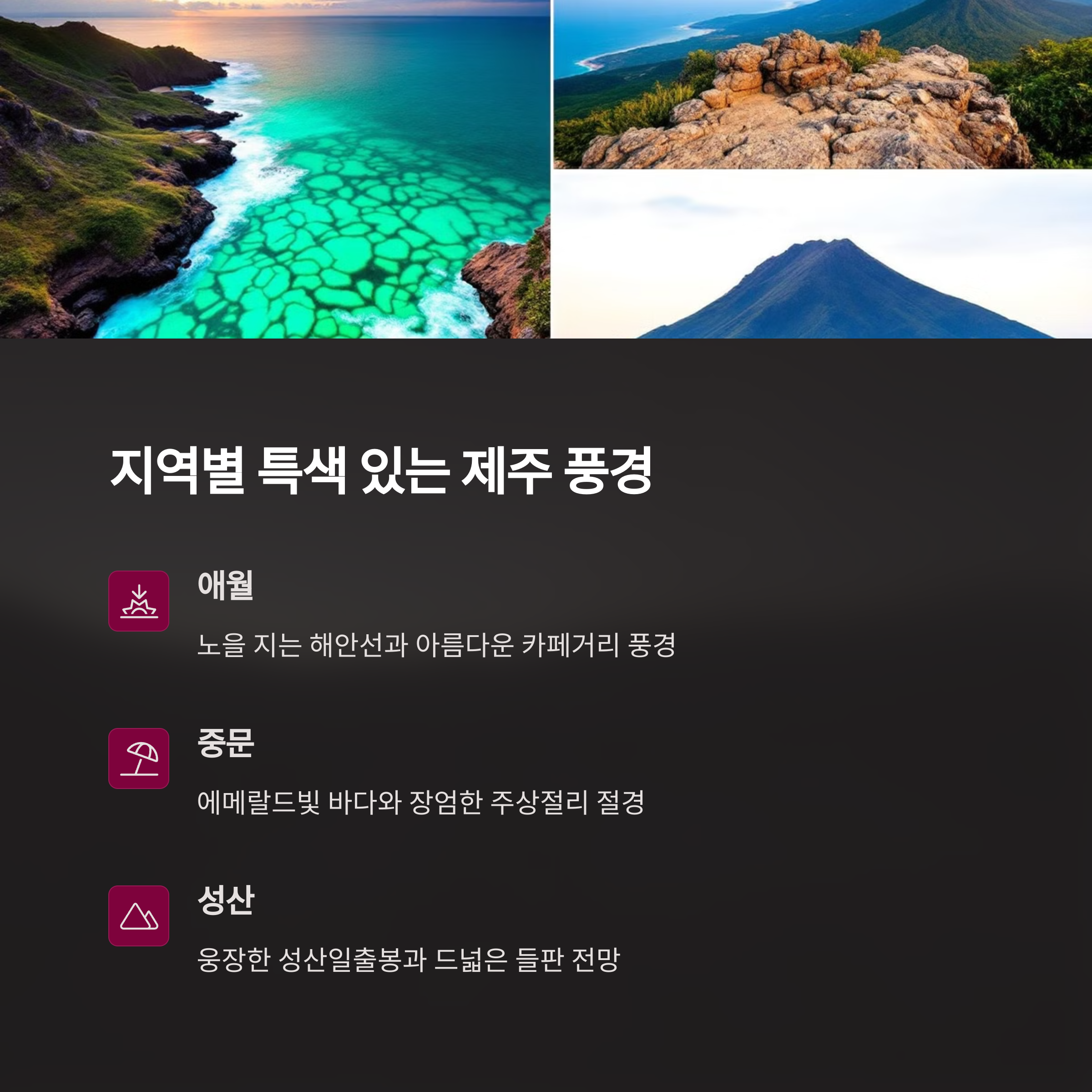 | 바다, 산, 오름 조망 가능한 명소 중심 | 감성 충만한 인테리어와 로맨틱한 조명 | 후기 기반 실제 만족도 높은 순위 |