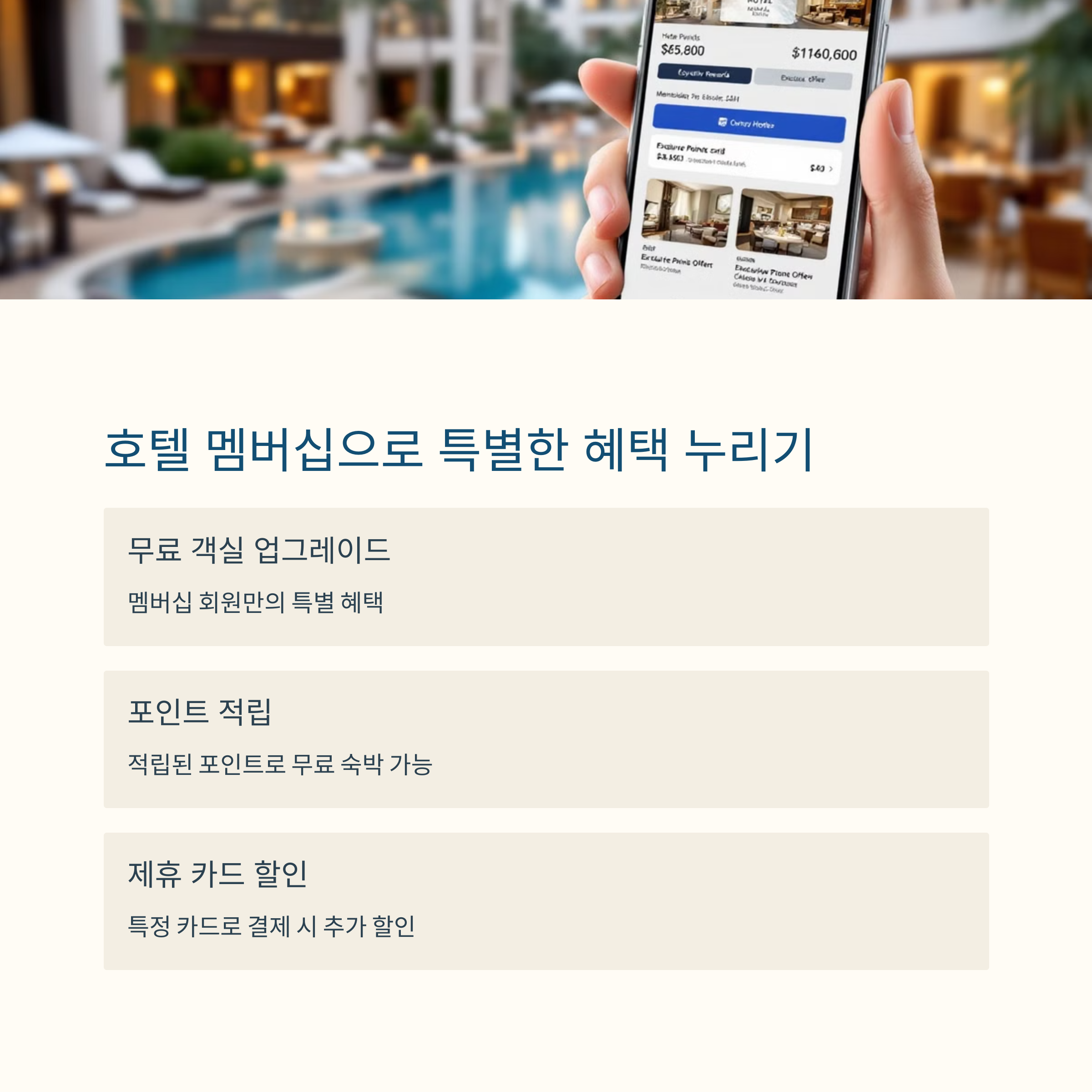 많은 사람들이 간과하는 또 하나의 전략은 멤버십 프로그램과 제휴 카드 활용입니다. 호텔마다 운영 중인 멤버십에 가입하면 체크인 시 무료 업그레이드, 조식 제공, 레이트 체크아웃 등 다양한 혜택을 받을 수 있습니다. 특히 신용카드 중에는 특정 호텔과 제휴되어 최대 10% 이상 할인을 제공하는 경우도 있으며, 일부 카드사는 숙박권 또는 포인트 전환 혜택도 포함되어 있어 연 1~2회 이상 호캉스를 즐기는 분들에게는 큰 도움이 됩니다. 이처럼 미리 준비하고 조사하면 같은 호텔, 다른 비용의 차이를 직접 체감하실 수 있습니다.