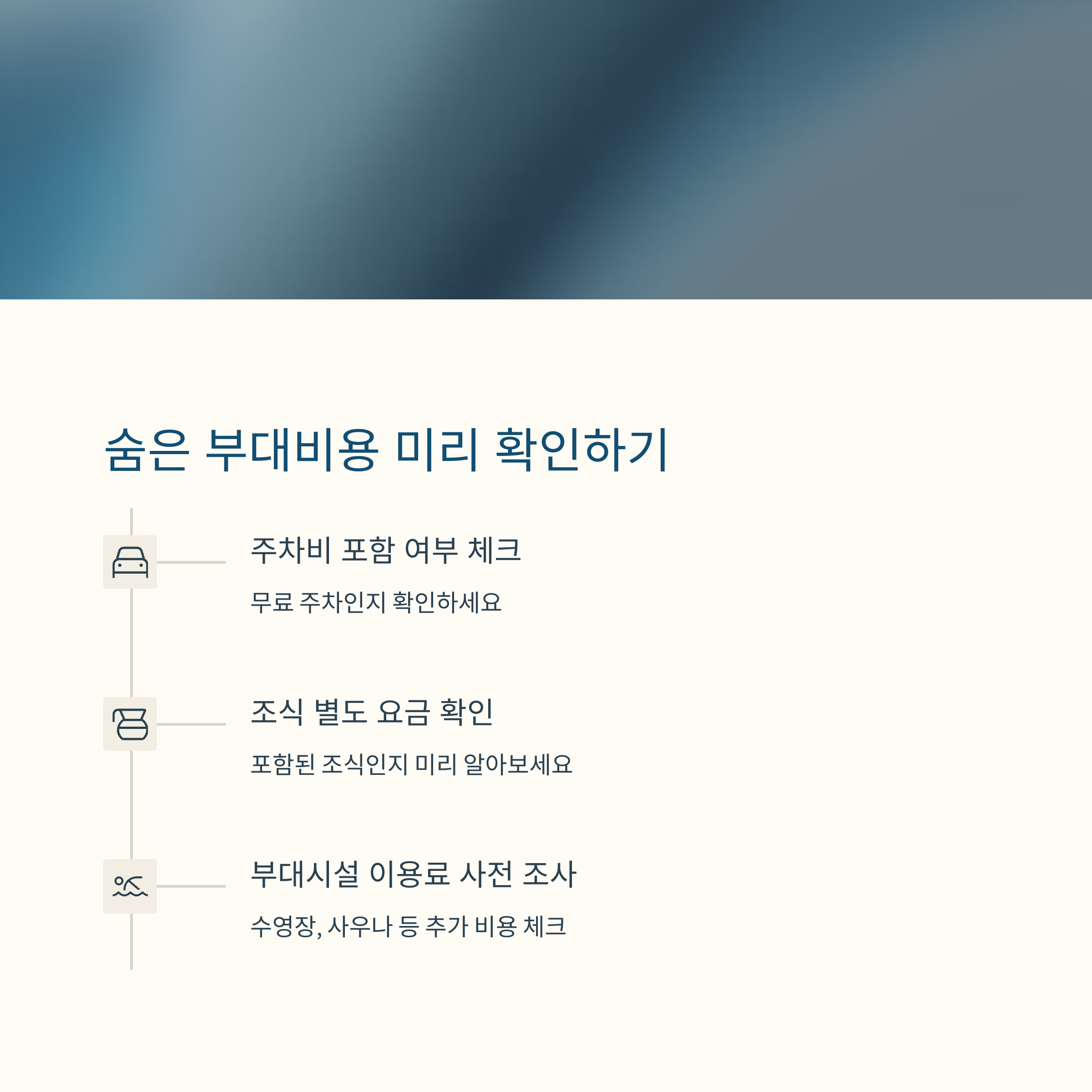 마지막으로 체크해야 할 포인트는 추가 요금입니다. 숙박비 외에도 주차 요금, 룸서비스, 부가세, 봉사료 등이 예상보다 큰 부담으로 작용할 수 있습니다. 예약 전 이러한 조건을 꼼꼼히 확인하고, 무료 주차, 조식 포함 패키지 등을 비교하여 선택하는 것이 좋습니다. 또한 주변 편의시설을 이용해 식비를 줄이거나 편의점, 배달 등을 적절히 활용하는 것도 예산을 아끼는 방법입니다. 작은 차이가 모이면 큰 절약으로 이어진다는 점을 기억해 주세요.