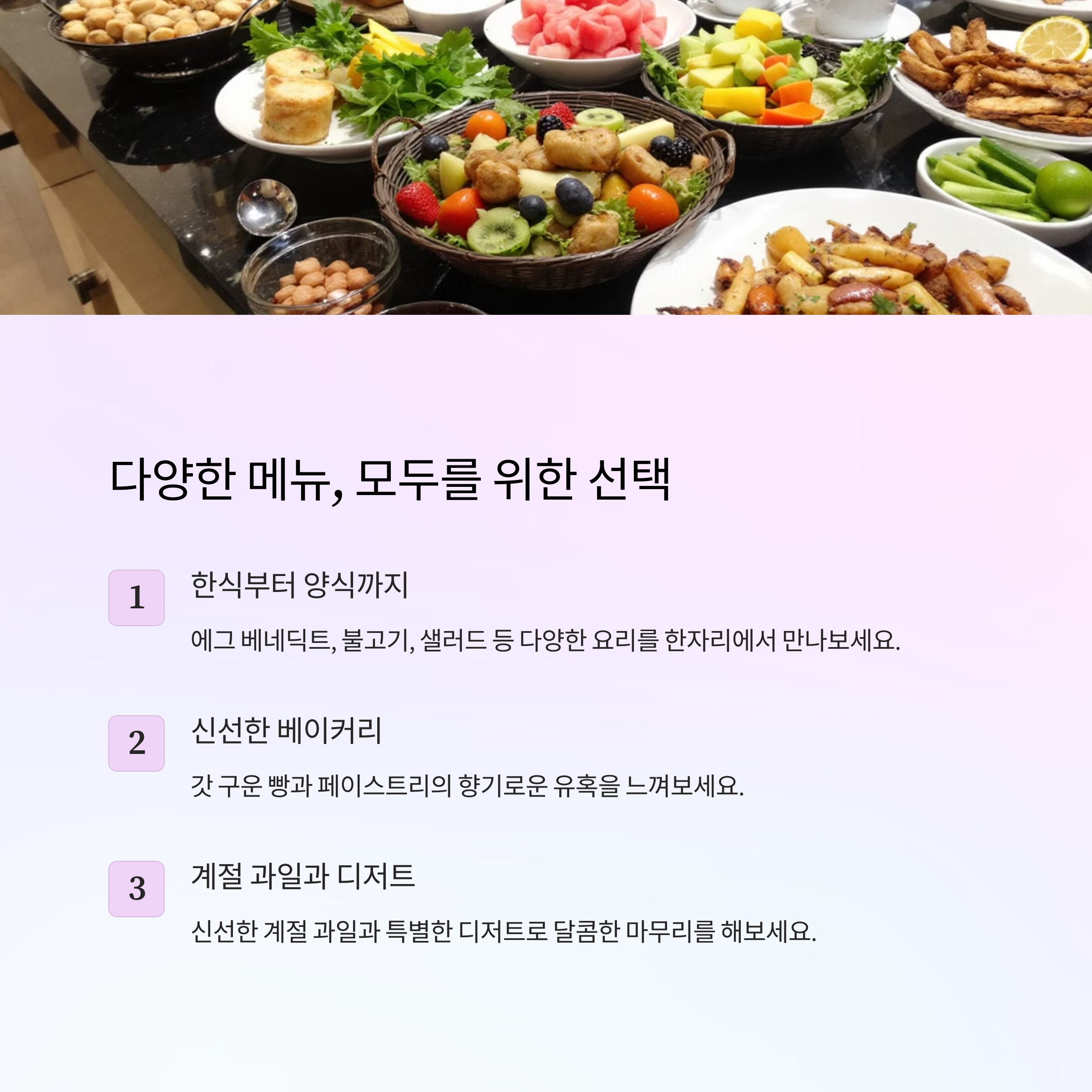 | 호텔 조식 퀄리티 | 레스토랑급 뷔페 구성으로 감동적인 아침 제공 |