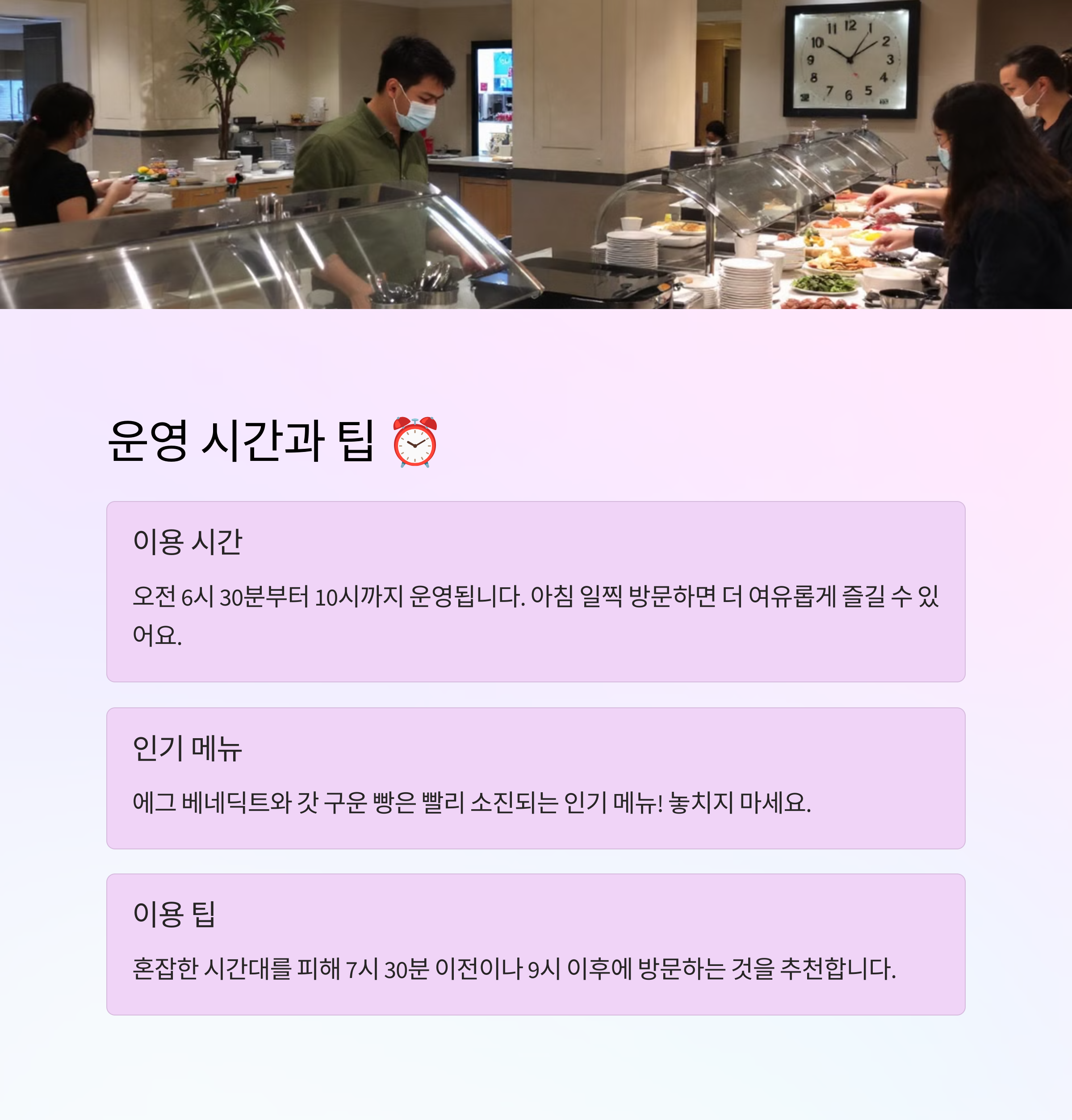 | 조식 운영 시간 | 추천 메뉴 | 분위기 |