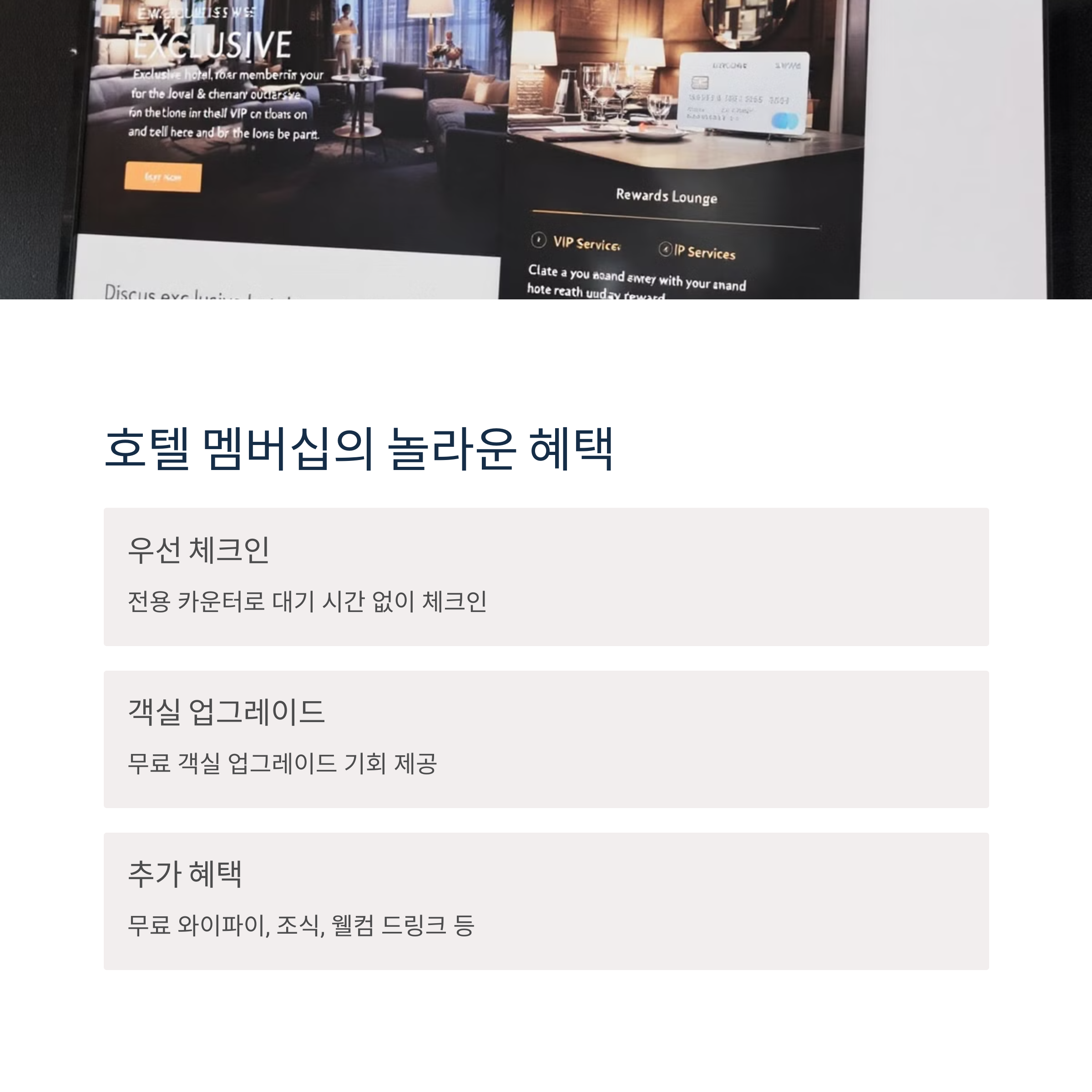 마지막으로 소개할 팁은 회원 혜택의 활용입니다. 호텔 멤버십 등급이 높을수록 우선 체크인 혜택을 받을 수 있고, 전용 창구나 모바일 키를 통해 대기 없이 바로 입실이 가능한 경우도 있습니다. 평소 자주 이용하는 체인 호텔이 있다면 멤버십 가입을 고려해보세요. 누적된 이용 실적이 쌓이면 다양한 혜택을 제공받을 수 있고, 체크인뿐만 아니라 룸 업그레이드나 웰컴 기프트 등의 부가 서비스도 기대할 수 있습니다.