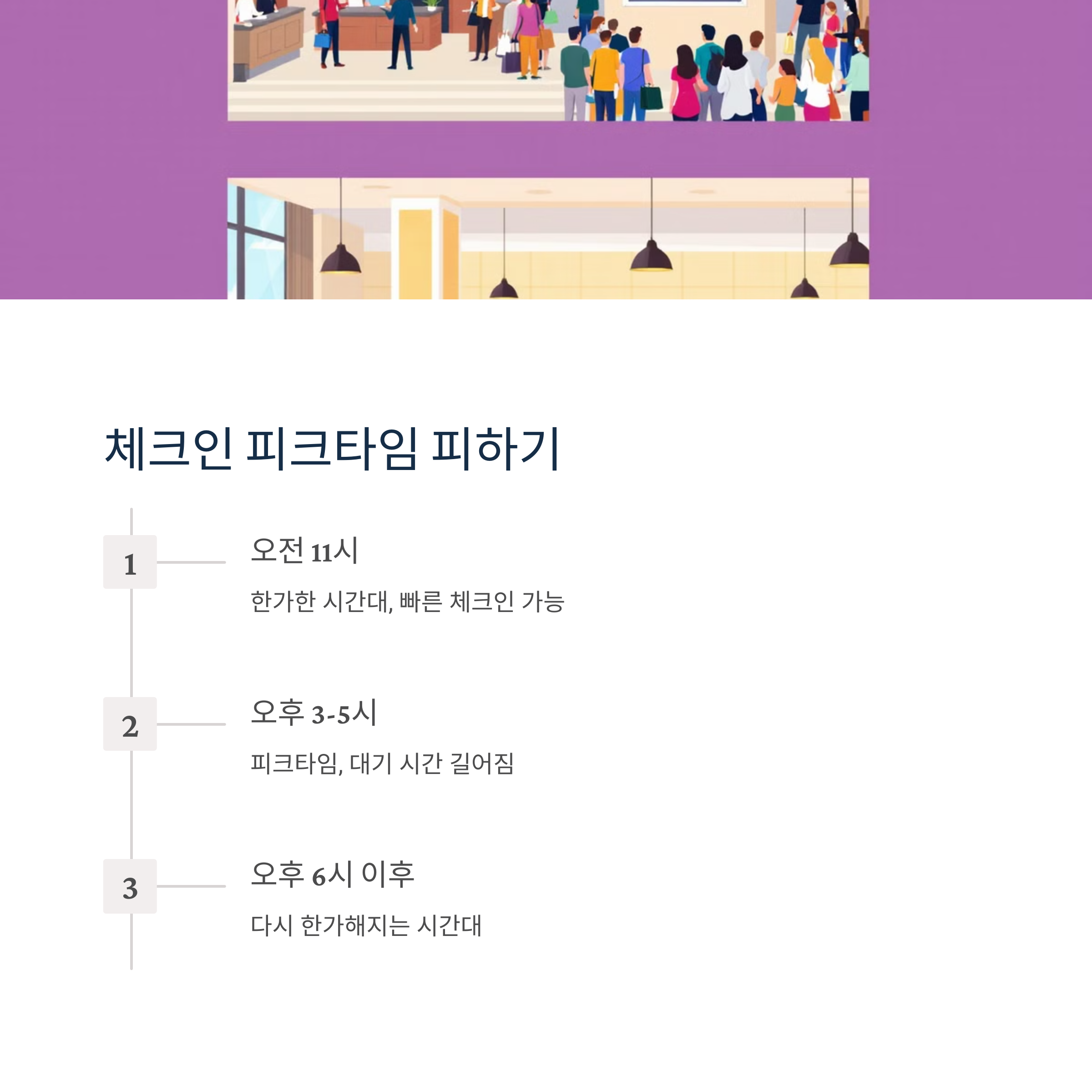 | 프론트 대기 줄 피하기 | 피크타임을 피한 도착이 유리합니다. |